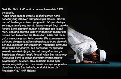 Dari Abu Sa’id Al-Khudri ra bahwa Rasulullah SAW bersabda, “Akan turun kepada umatku di akhir zaman nanti cobaan yang dahsyat dari pemimpin mereka. Belum pernah terdengar cobaan yang lebih dahsyat darinya sehingga bumi yang luas itu terasa sempit bagi mereka karena bumi dipenuhi dengan kejahatan dan kezaliman. Seorang mukmin tidak mendapatkan tempat berpindah dari kezaliman itu. Kemudian, Allah Swt mengutus seseorang dari keturunanku. Dia akan memenuhi bumi dengan keadilan sebagaimana bumi dipenuhi dengan kejahatan dan kezaliman. Penduduk bumi dan langit ridha dengannya, dan bumi tidak menyimpan sesuatu pun dari bijinya, kecuali mengeluarkannya. Begitu juga dengan langit, kecuali Allah Swt menuangkannya ke bumi. Ia hidup di tengah-tengah mereka selama tujuh, delapan, atau sembilan tahun agar semua yang hidup dan mati menikmati apa yang tellah diperbuat Allah Swt terhada penduduk bumi dari kebaikan-Nya.”(HR Hakim).